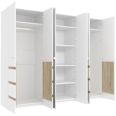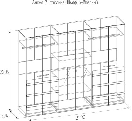 Глубокий распашной шестидверный шкаф для одежды и белья с зеркалами с чёткой организацией внутреннего пространства обеспечивает комфортное хранение вещей всей семьи. Конструктивом Шкафа предусмотрены: отделение для хранения белья с регулируемыми по высоте полками и 2 отделения для одежды со стационарной штангой. Дверки Шкафа для одежды и белья АНОНА 7 с доводчиками для плавного и бесшумного закрывания. Их украшают аккуратные вставки в декоре Дуб Сонома и зеркала во весь рост с фацетом.