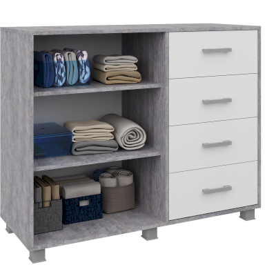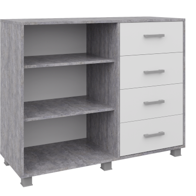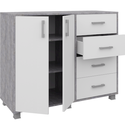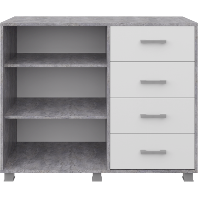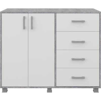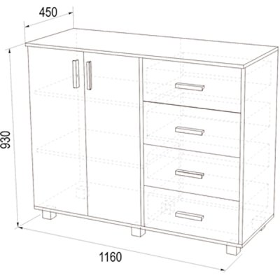 Фурнитура: Пластиковые ручки, шариковые направляющие, 4 выкатных ящика, петли распашной двери без доводчиков