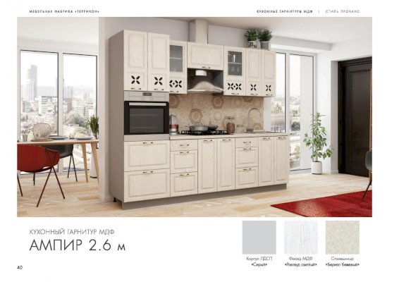 Хотите готовить и проводить время на кухне с удовольствием? Укомплектуйте помещение красивой и удобной мебелью — закажите гарнитур «Ампир»! Комплект эстетичен и функционален. В него входят все необходимые для создания идеальных условий элементы. Холодные оттенки поддерживают праздничное, романтическое настроение. Немного гламура в обстановку вносят прорезные орнаменты на дверцах подвесных шкафчиков.