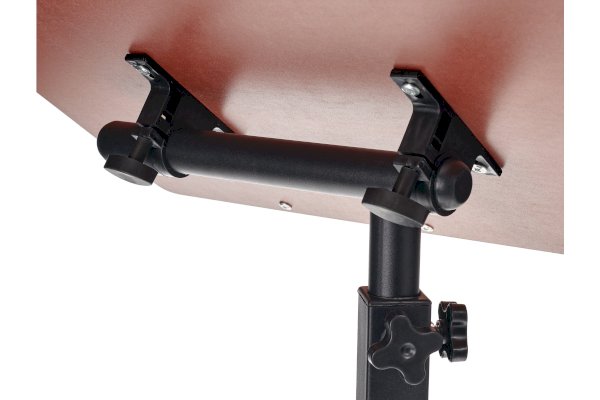 Столик оборудован поворотной столешницей из МДФ и металлическим основанием. Угол поворота столешницы составляет 180°, вплоть до вертикального положения. Высота подъема регулируется в диапазоне от 65 до 97 см. На столешнице имеются ограничители для ноутбука, планшета, предотвращающие падение гаджета.