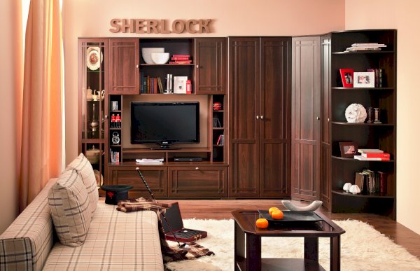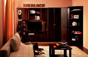 Широкий выбор модулей коллекции SHERLOCK помогает создать уютную гостиную с комфортным рабочим местом, что очень важно для маленькой квартиры. Вместительный 15 Стол письменный можно расположить между шкафами и навесить над ним 4 Шкаф навесной на любой удобной для Вас высоте. 5 Тумба МЦН – отличный вариант не только для хранения вещей, но и для размещения на ней телевизора. Шариковые направляющие тумбы обеспечивают плавность хода выдвижных ящиков. Большой выбор шкафов коллекции SHERLOCK дополнит и то, что 10 Шкаф угловой можно выбрать либо с фасадом Стандарт, либо с фасадом Зеркало. Все фасады модулей коллекции декорированы классическим переплетом из МДФ.