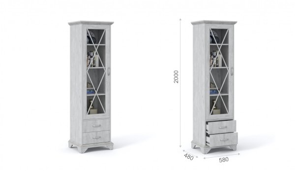Пенал-витрина добавит уюта в интерьер гостиной в стилях неоклассика или прованс. Белые рамочные фасады с фактурой и рисунком натурального дерева, декоративные крестообразные накладки, фигурные ножки и карниз все это придает комнате элегантный и светлый вид. За прозрачным фасадом можно расположить предметы декора, красивый сервиз или книги. Выдвижные ящики на телескопических направляющих предназначены для хранения различных вещей. Мебель выполнена из экологичных материалов.