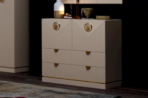 Конструкция комода включает два широких ящика, а также два закрытых отделения с дверками. Украсить интерьер можно разместив на столешнице комода декоративные предметы, вазы или любимые фотографии.
