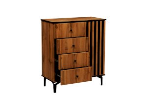 Четыре ящика расположены слева – один под другим. Внешне они кажутся небольшими, но на самом деле достаточно вместительны. В зависимости от тематики помещения в них можно разложить бумаги, документы, нижнее белье, полотенца. Справа, за распашной дверцей, два отделения. Сюда можно убрать постельное белье, подушки и одеяла – места для этого вполне достаточно. На верх комода можно поставить телевизор, а если повесить над ним зеркало и на столешнице расставить духи и косметику, он превратится в туалетный столик!