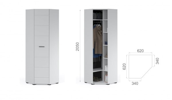 Угловой шкаф выполнен в современном стиле – сочетает в себе функциональность и эффектный внешний вид: строгая горизонтальная фрезеровка фасадов, ручки и задняя стенки контрастного черного цвета. Глянцевые белые фасады High Gloss из МДФ наполняют комнату светом, делают ее просторнее. Внутри предусмотрены секции для белья и отделение со штангой. Шкаф позволяет рационально использовать пространство и будет хорошо смотреться даже в небольшой комнате, служит связующим звеном для составления угловой системы хранения. Идеально компонуется со всеми модулями системы Йорк.