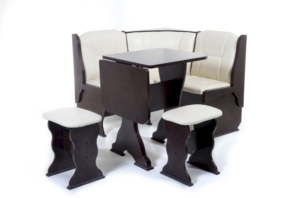 В гарнитур входит угловой диван, два табурета и раскладной стол. В угловой части дивана есть удобная полочка.