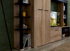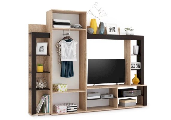 Гостиная Торонто - оригинальный дизайн, вместительность и небольшие габариты. Занимая мало места по глубине и ширине, она включает в себя платяной шкаф с штангой, нишу под ТВ и множество полок для приставок, колонок, книг и декора. Использование популярных цветов Дуб сонома и венге даёт возможность легко сочетать эту стенку в гостиной с другими предметами мебели – столами, журнальными столиками, стеллажами или комодами. Выполнена из экологичных материалов.